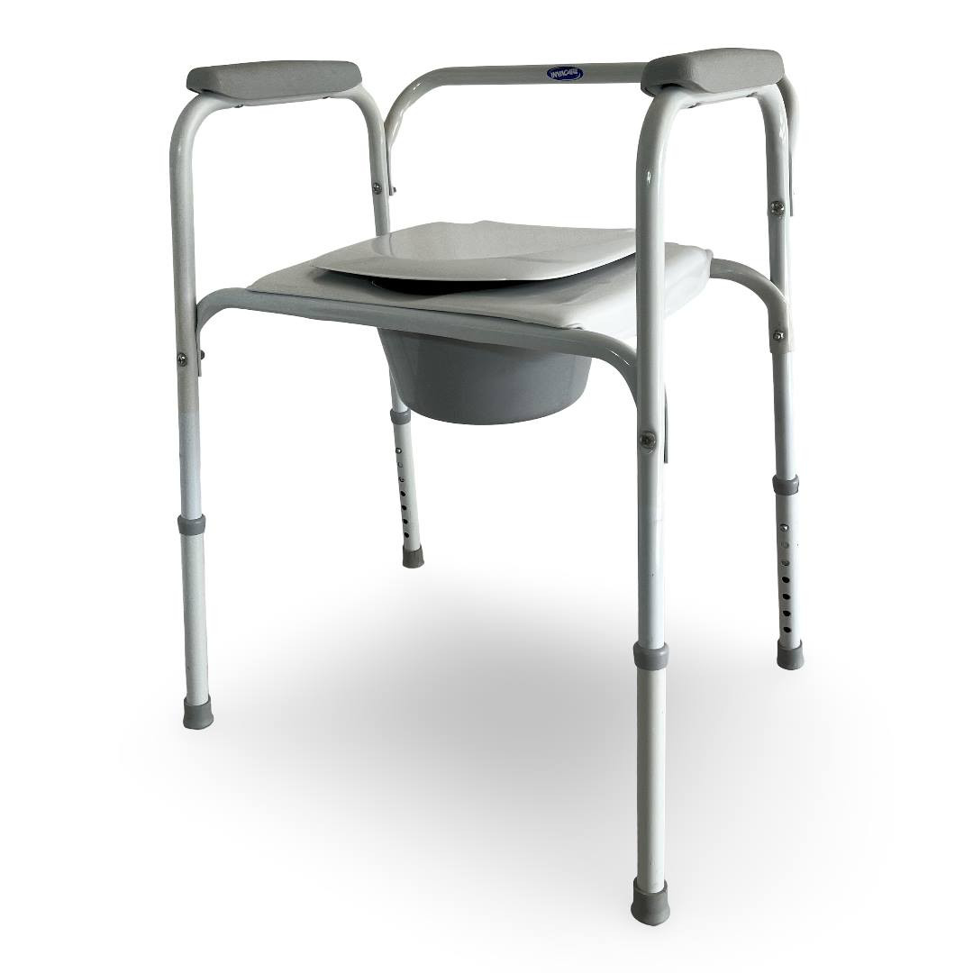 La chaise de toilettes Styxo INVACARE, ici reconditionnée, combine trois fonctions pratiques dans un seul dispositif : chaise percée autonome, cadre de sécurité, et réhausseur de toilettes.
