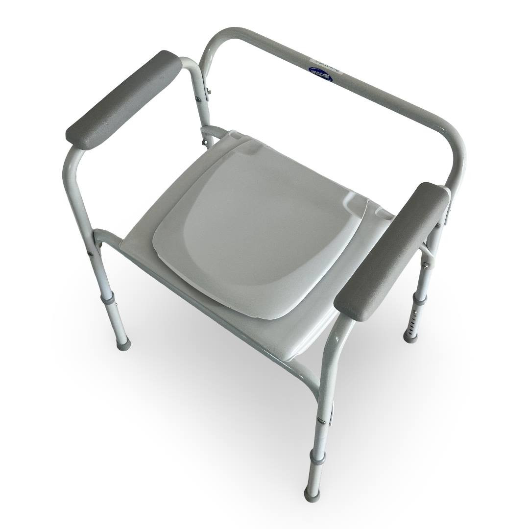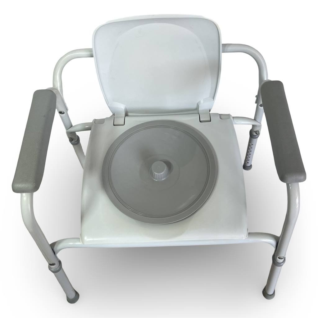 Compacte (62 x 49 cm hors-tout), cette chaise convient à la plupart des sanitaires domestiques ou collectifs.