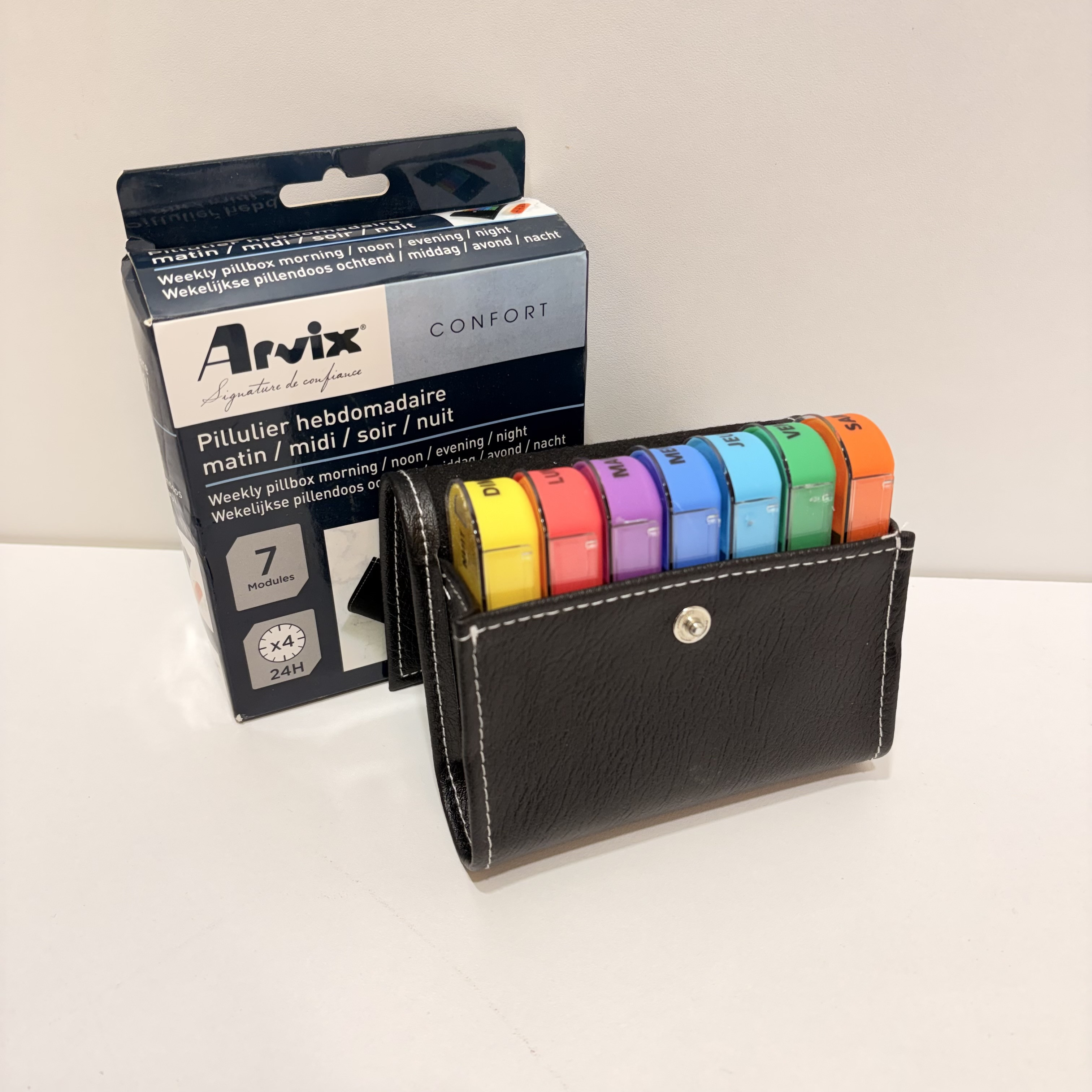 Pilulier 7 jours + pochette, 4 prises/jour, pratique, élégant et facile à transporter.